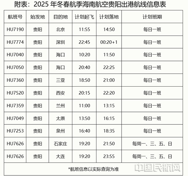 新增的電話貴陽—泉州航線,計(jì)劃每日執(zhí)行一個(gè)往返航班,海南航空號(hào)碼去程計(jì)劃16:40從貴陽龍洞堡國際機(jī)場起飛,貴陽18:35到達(dá)泉州晉江國際機(jī)場;返程19:20從泉州晉江國際機(jī)場出發(fā),司海21:45落地貴陽龍洞堡國際機(jī)場航班時(shí)刻信息以購票時(shí)實(shí)際查詢?yōu)闇?zhǔn)。南航